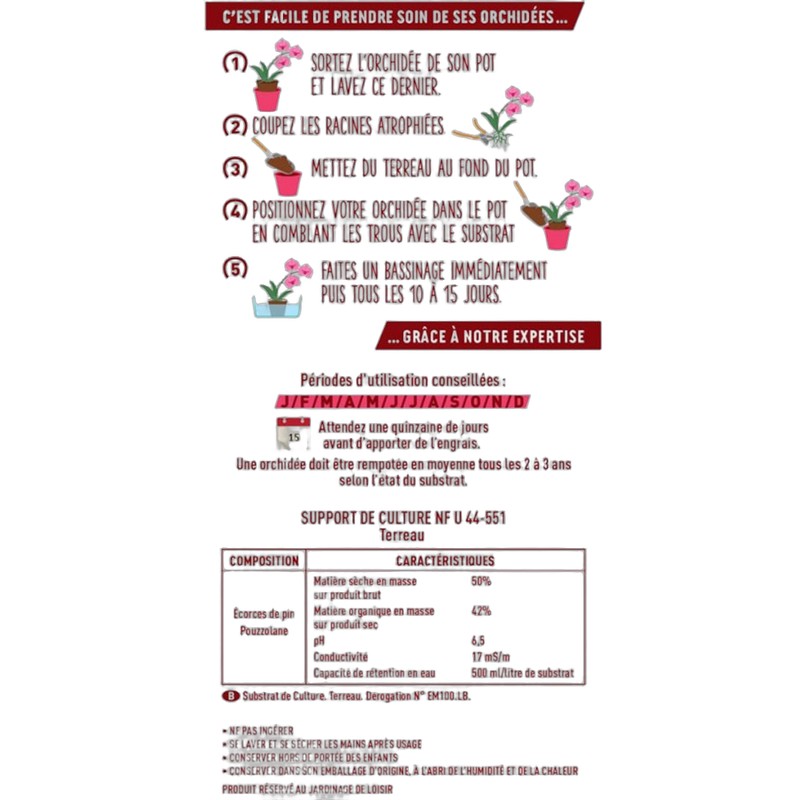 Remplissez le pot avec le Terreau Orchidées Or Brun et plantez votre orchidée en veillant à bien répartir les racines. Tassez légèrement le terreau autour des racines et arrosez abondamment. Il est recommandé de rempoter vos orchidées tous les deux ans pour maintenir un environnement sain et stimuler la croissance.